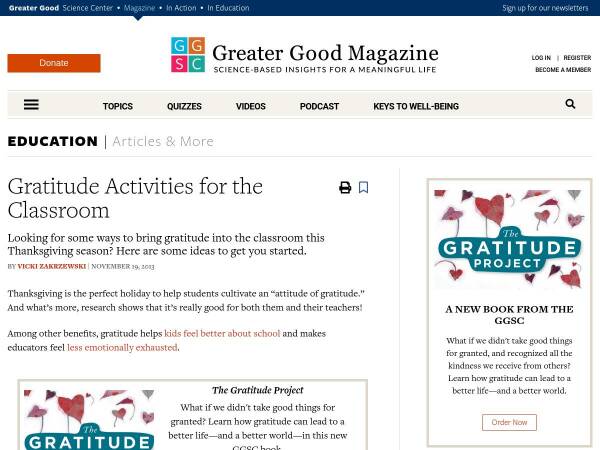 List of gratitude classroom activities in article by GGSC “Gratitude Activities for the Classroom,” such as gratitude classroom book, gratitude photos, gratitude paper chain, and gratitude spies