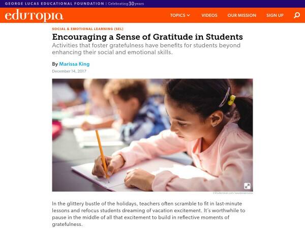 Gratitude classroom activity suggestions in brief article by Edutopia, “Encouraging a Sense of Gratitude in Students,” such as letter writing, growth journaling, and secret acts of kindness.